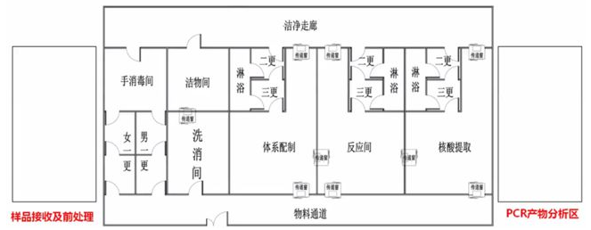 雙走廊四/三區:雙走廊即潔凈走廊和物料通道(普通走廊、污染走廊)。四/三區主要指中間的功能區,做熒光定量PCR只需三區足以(體系配制、核酸提取、反應間),若是普通PCR/RTPCR,必須有PCR產物分析區(建議獨立在三區之外)。